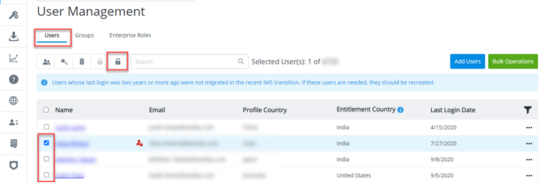 3. Click Unlock Users icon on the screen above user list to enable login for the selected locked user(s).