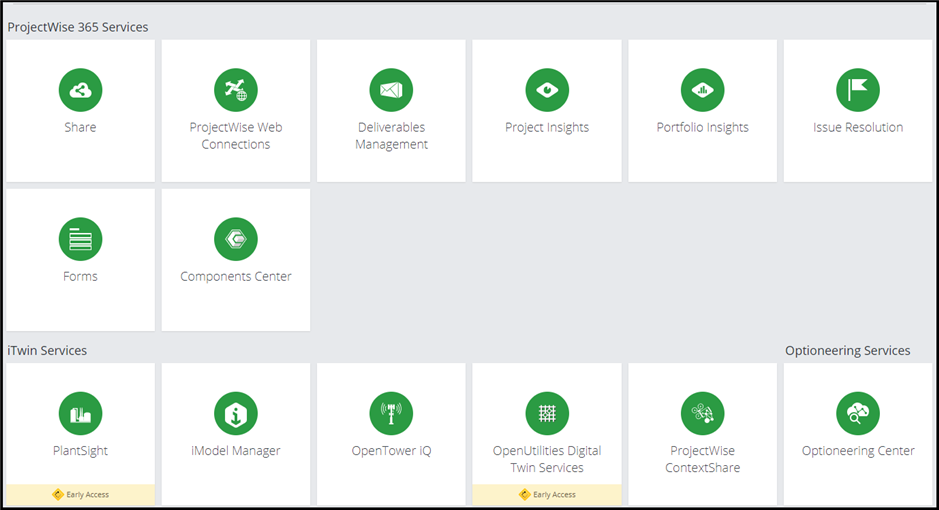 The ProjectWise Project portal provides access to all of the available Services that can be associated to a ProjectWise Project. The ProjectWise Project portal is the gateway to the Services you may need to complete your work.