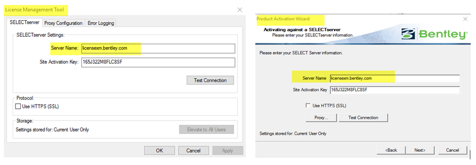 Same Sever Name should be entered under License Management Tool when you select Tools > Options & Tools > Product Activation Wizard.