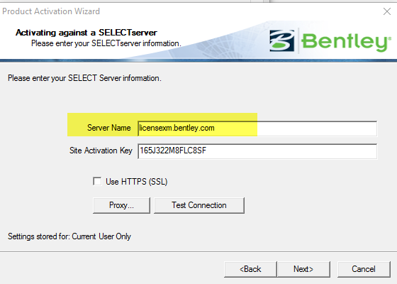 While activating licenses through Tool > Product Activation Wizard > Server Name should match with the document received by you from the Bentley Systems analyst.