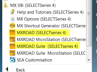 Create Shortcut for MXRoad Suite or MXRoad or both, go to All programs > Bentley > MX Shortcut Generator, select MXRoad Suite or MXRoad or Both.