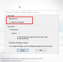 1. 아래 사진과 같이, 프로그램 구동 시 [Full License] 항목에 STAAD.Pro과 STAAD.Pro Advance 두 모드 보입니다. 구입한 모드로 선택후, [Accept] 버튼 누릅니다.