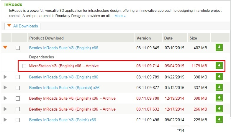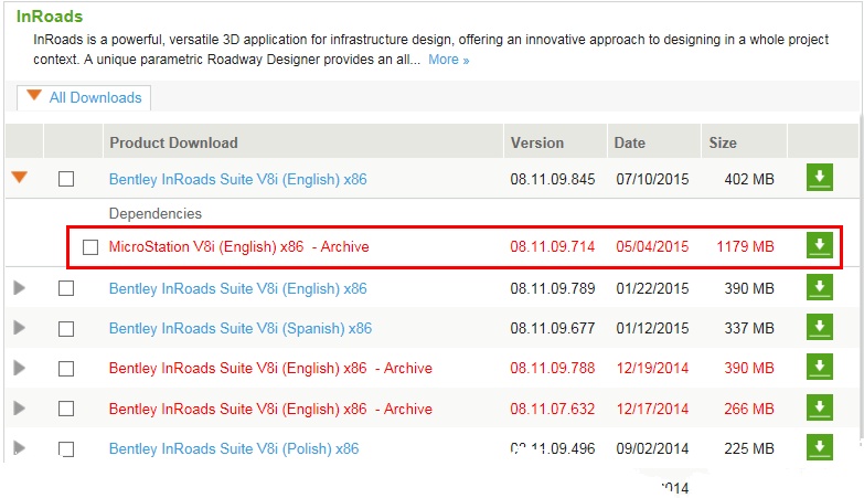 The 08.11.09.714 version of MicroStation was compiled specifically for the 08.11.09.845 versions of GEOPAK/InRoads/MX. The best way to access and download MicroStation from Bentley's SELECTServices site is to search for the 08.11.09.814 version of the civil product and download it with its dependent version of MicroStation as Shown below:
