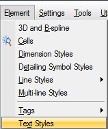 - Re-open MXRoad in a project and go to Element>Text Styles. You will see that the custom text styles are now part of the default styles in MXRoad.
