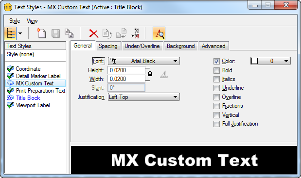 The mxtips annotation files used in the Final Drawings functionality of MX use Microstation text styles. If a user wants custom text styles to match company CAD standards they can add them to the libary file for the text styles (*.dgnlib).