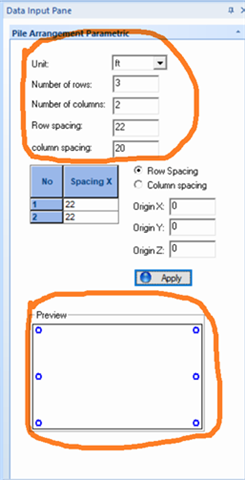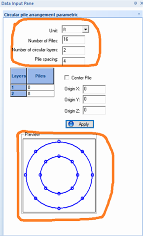 桩的布置提供了3种方式,第一种类似梁的布置,在表格中输入参数(坐标点)即可;第二种为矩形布置,以行和列的概念进行输入;第三种为环形布置,并且可以是多重环形,也可以选择是否设置中心桩。对于桩位的修改和删除,可以在桩的位置列表中进行,也可以直接在视图中选择(蓝色)后Delete键。