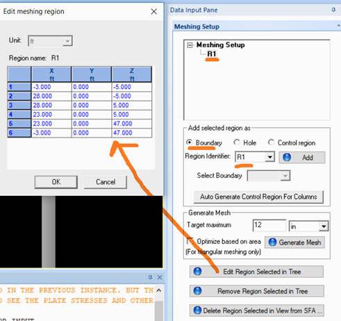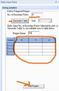 筏板网格生成,首先要对筏板的外边缘进行定位,程序提供了多种方式,最通用的方式是Using polyline,具体为:输入边缘的点数>Generate Table>Region Name>填写边缘控制点的坐标>Add Region来完成。对于已经生成的筏板网格,也可以通过Edit Region Selected in Tree进行编辑。