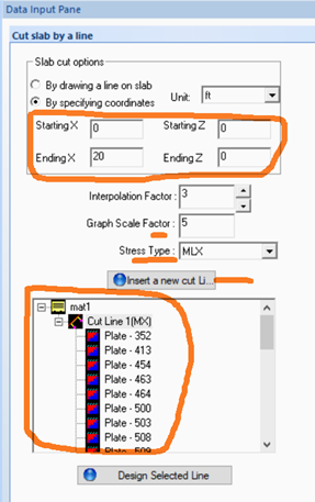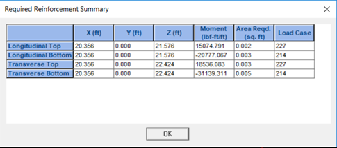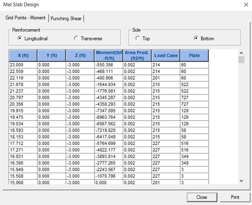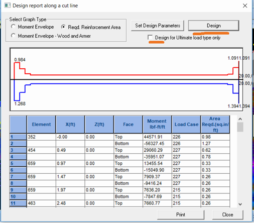 点击Design Selected Line则可以进一步看到该线域上筏板的设计报告,比如用户对柱间线域上的筏板比较关注,想了解受力情况,或者想在筏板柱间轴线上设置暗梁,则该项功能可以提供辅助。