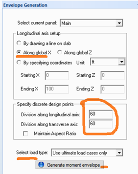 生成弯矩设计网格,然后在每个网格交点位置计算其弯矩包络值。网格默认沿每个方向划分为60个单位,如果弯矩设计网格的划分考虑筏板长宽的比率,则可勾选Maintain Aspect Ratio,此时指定一个方向的划分点数,另一个方向的点数自动根据筏板长宽比算出。需要注意的是,由于弯矩沿不同方向其值不同,因此做弯矩设计时,需先指定纵轴方向(注:并不一定是筏板真实的纵轴)。