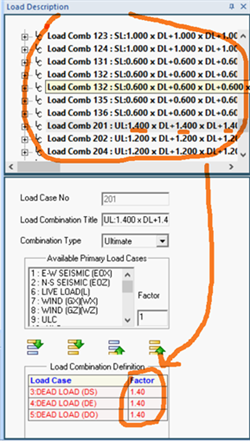 另外,在进行上部结构分析时,也会存在组合工况,这些组合工况导入SFA后,默认的工况类型为 Primary,此时这些工况也将参与到自动生成组合,除非用户修改类型为Service或者Ultimate.