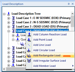 通常,每一个基本工况下的Reaction荷载数量与支座数量是一致的,如果要新增支座并添加相应荷载,则需在Column Position中增设柱位置,然后在选定的基本工况通过Add Reaction Load来添加额外荷载。如果仅是新增荷载而不需要新增支座,则根据荷载的特征,选择施加点荷载或者面荷载等,程序提供了多种选择,右键单击基本工况即可看到相应的选择菜单。点击相应的选型后,即可看到荷载的设置面板,如Rectangular Load,需要设定矩形面荷载的角点坐标及荷载集度。(注:对于这种非Column Reaction荷载,参数设定完并添加荷载后,荷载即在相应位置生成,不需要额外执行Assign Load。)