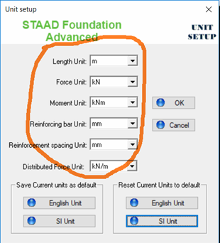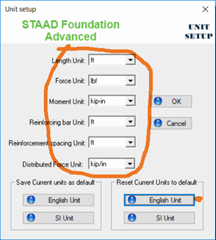 默认为SI制,项目为英制,点击Reset Current Units to default中的English Unit,程序会根据English Unit的默认设置(在Save Current units as default中进行),将当前单位制式立刻切换到英制;同样的,点击Reset中的SI Unit,则程序会根据SI Unit中的默认设置将当前单位立刻切换为国际标准单位。