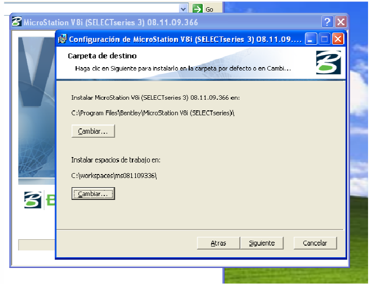 5) Presione el botón de cambiar si desea usar otra carpeta diferente de la dada por defecto para la instalación o para los espacios de trabajo