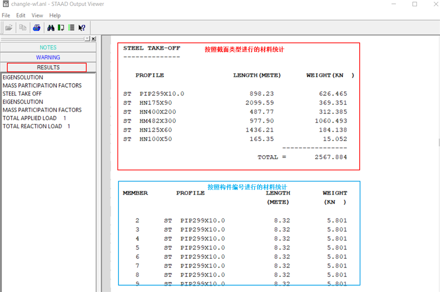 对于采用SSDD建模的门式刚架结构,SSDD提供选项“设计-构件材料表”可以得到模型中各类构件的材料统计表格,那么对于STAAD中建立的普通钢结构应该如何统计模型的材料表?又该如何按照用户指定类别进行统计?统计得到的材料重度是如何计算得到的?本文将针对这三个问题进行一一解答: