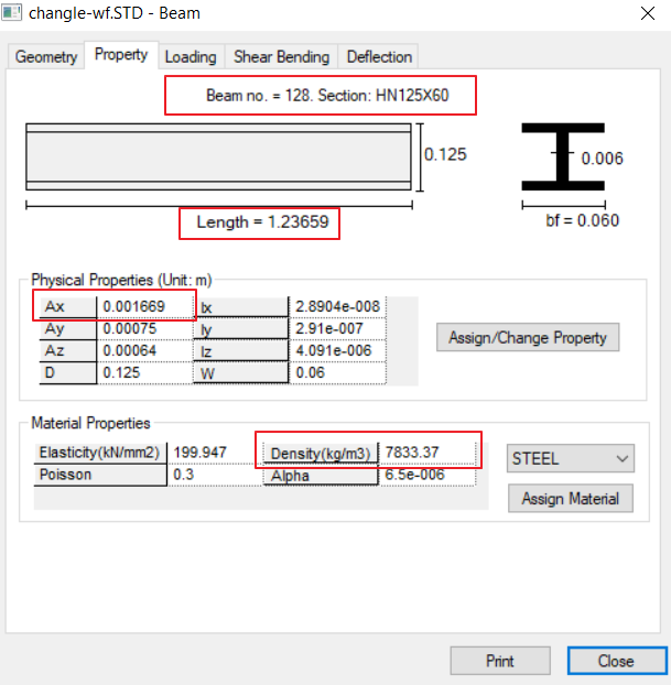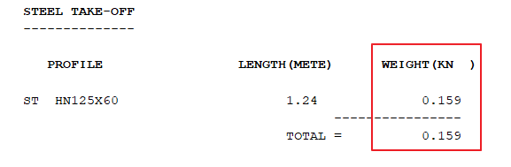 则该构件的重量WEIGHT=Ax×Denstity×Length×9.8=0.001669×7833.37×1.24×9.8/1000=0.159KN