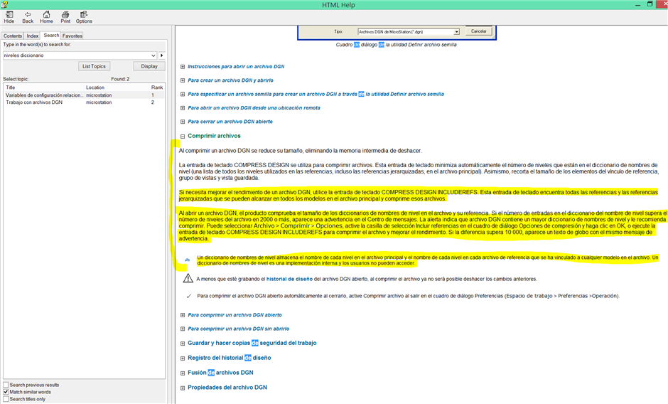 Al abrir un archivo DGN, el producto comprueba el tamaño de los diccionarios de nombres de nivel en el archivo y su referencia. Si el número de entradas en el diccionario del nombre de nivel supera el número de niveles del archivo en 2000 o más, aparece una advertencia en el Centro de mensajes. La alerta indica que archivo DGN contiene un mayor diccionario de nombres de nivel y le recomienda comprimir. Puede seleccionar Archivo > Comprimir > Opciones, active la casilla de selección Incluir referencias en el cuadro de diálogo Opciones de compresión y haga clic en OK, o ejecute la entrada de teclado COMPRESS DESIGN INCLUDEREFS para comprimir el archivo y mejorar el rendimiento. Si la diferencia supera 10 000, aparece un texto de globo con el mismo mensaje de advertencia.