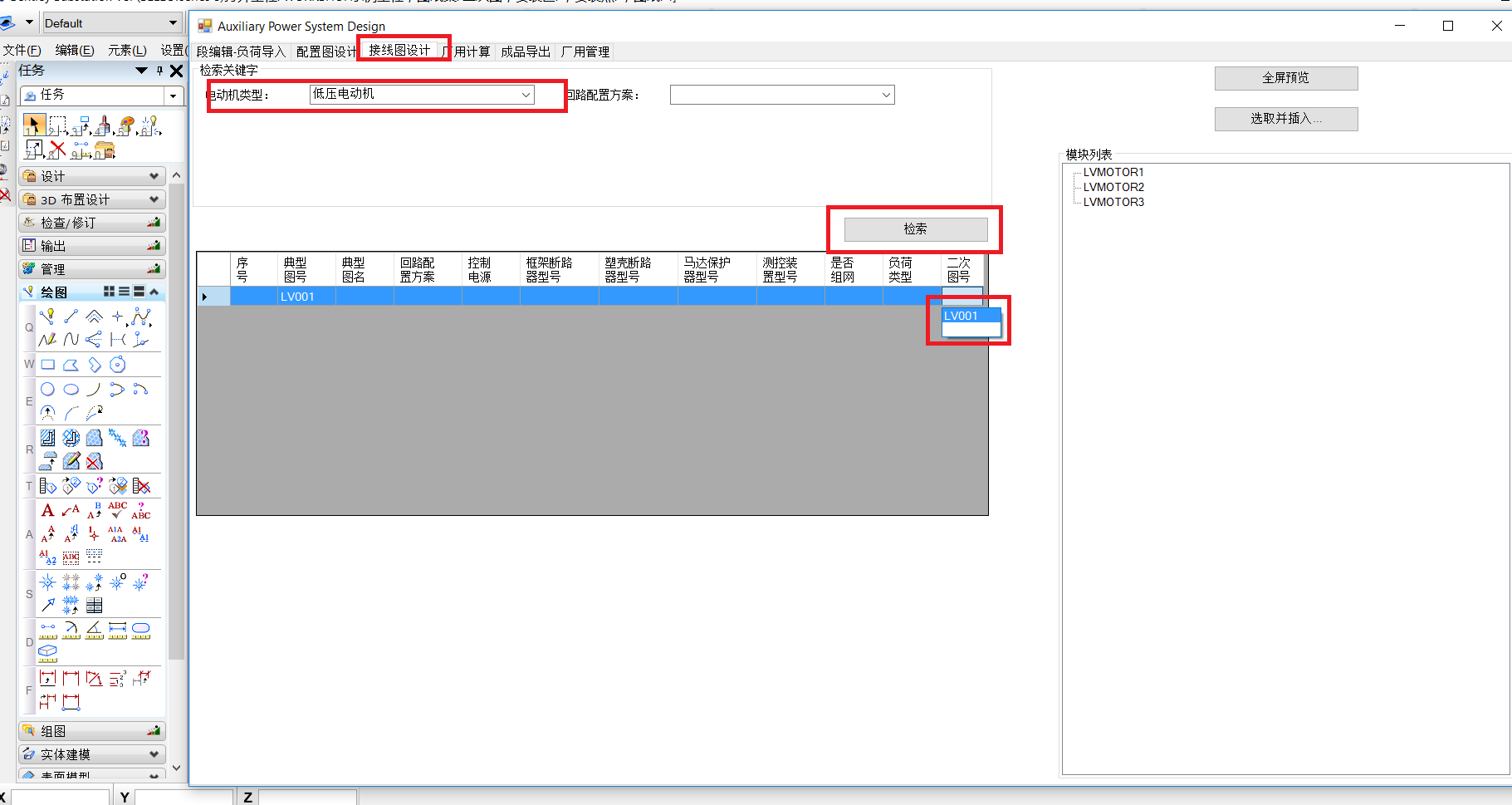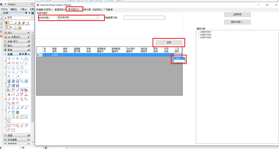 线图设计菜单,输入检索条件检索出需要的典型图,点击【选取并插入】程序将根据出图顺序,自动将模块列表中的模块插入到新建的二次图纸中。出图顺序已经在工程下“二次图”中进行了定义。