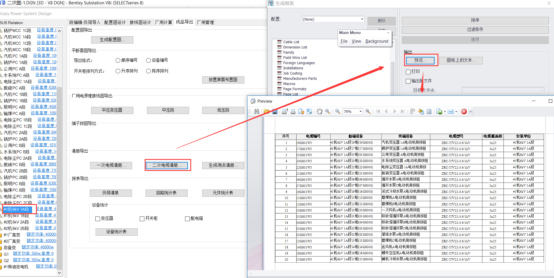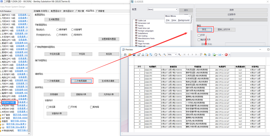 “成品导出”界面,选中要出的段(已经匹配过的段),点击“二次电缆清册”,确定重新编译列表,选择预览。