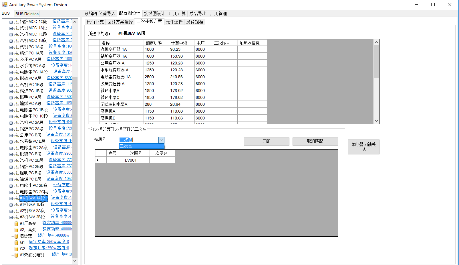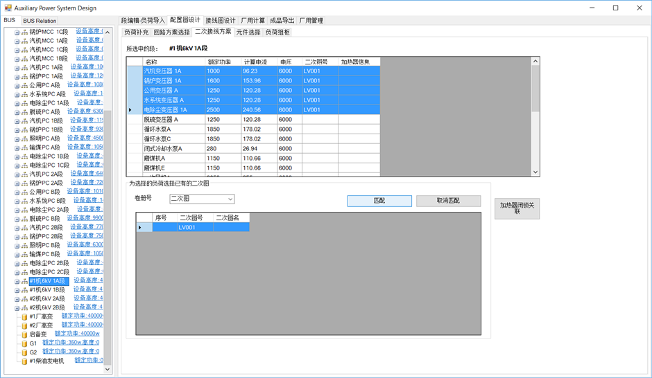 选中要匹配的负荷和图纸(可多选),点击“匹配”。匹配完成后在“成品导出”各项报表输出中,可以得到对应负荷的二次图统计数据。