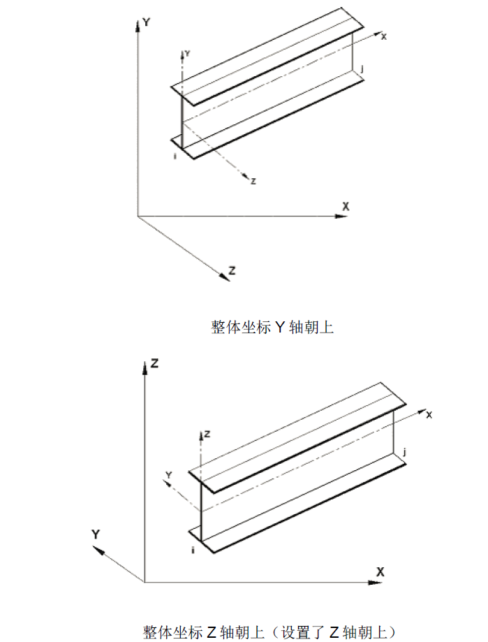 对每个单一构件都要用局部坐标系表示。局部直角坐标系的坐标轴都遵循右手法则。图1.5表示出以i为起点,j为终点的梁构件局部坐标轴示意图。此局部坐标系X轴的正方向是由i至j的连线确定的。利用右手法则可得到局部坐标系y和z轴的正方向。局部坐标y和z轴与截面的两个主惯性矩轴相一致。注意:局部坐标系统只能是直角坐标系。
