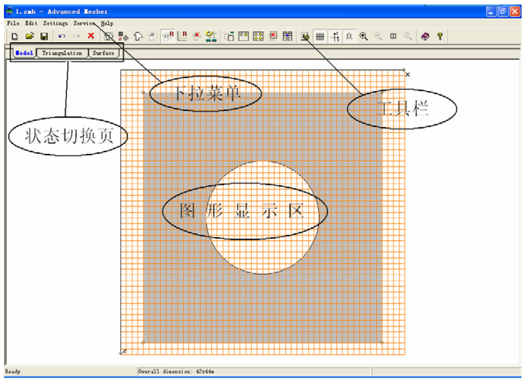 Mesher 界面由下拉菜单,工具条,状态切换页和图像显示区组成。