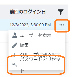 ユーザー ログインの右側にある 3 つのドットをクリックし、表示されるコンテキスト メニューから [パスワードをリセット] を選択します。ユーザーが新しいパスワードを作成できるパスワード リセット メールがユーザーに送信されます。