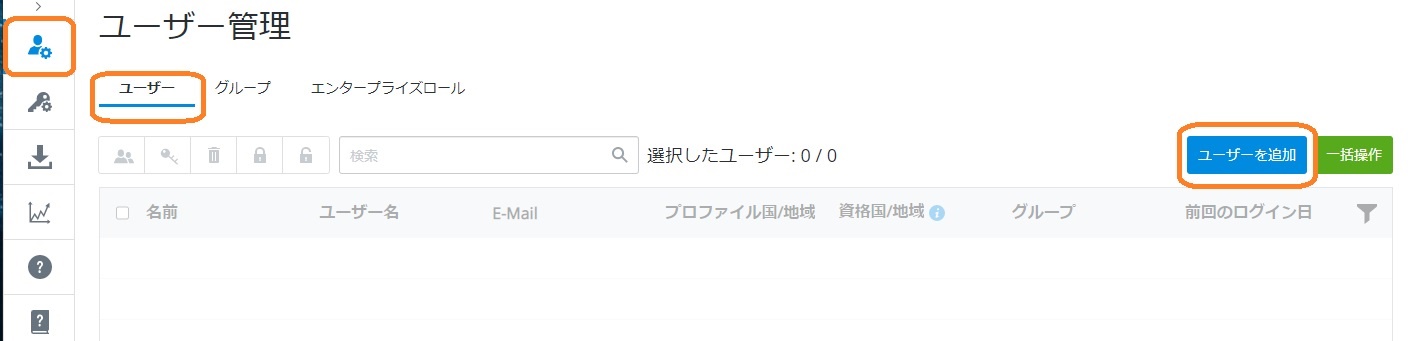 1. ユーザー管理サイトより、ユーザータブを選択し、右側の「ユーザーを追加」ボタンを押します。