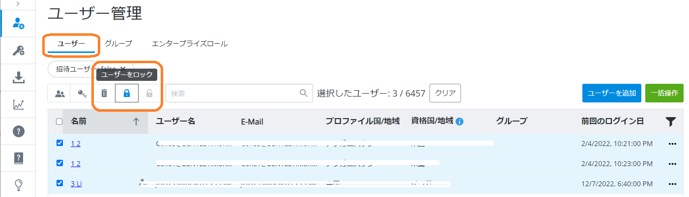 1. [ユーザー管理] 画面で、[ユーザー] タブをクリックしてユーザーを選択し、ユーザー リストの上の画面で [ユーザーのロック] アイコンをクリックして、選択したユーザーのログインを無効にします。