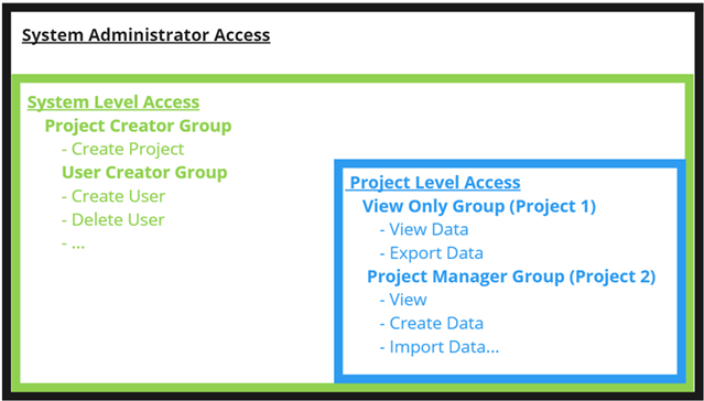 This is similar to “System Administrator Access” but allows restrictions to be placed on the user via Security Groups. This access level is not associated with any particular project but at assigned at the system level. Examples of this is the Project Creator Group which contains the Create Project role. Note that roles assigned at this level will propagate down to the project level and will apply to all projects.