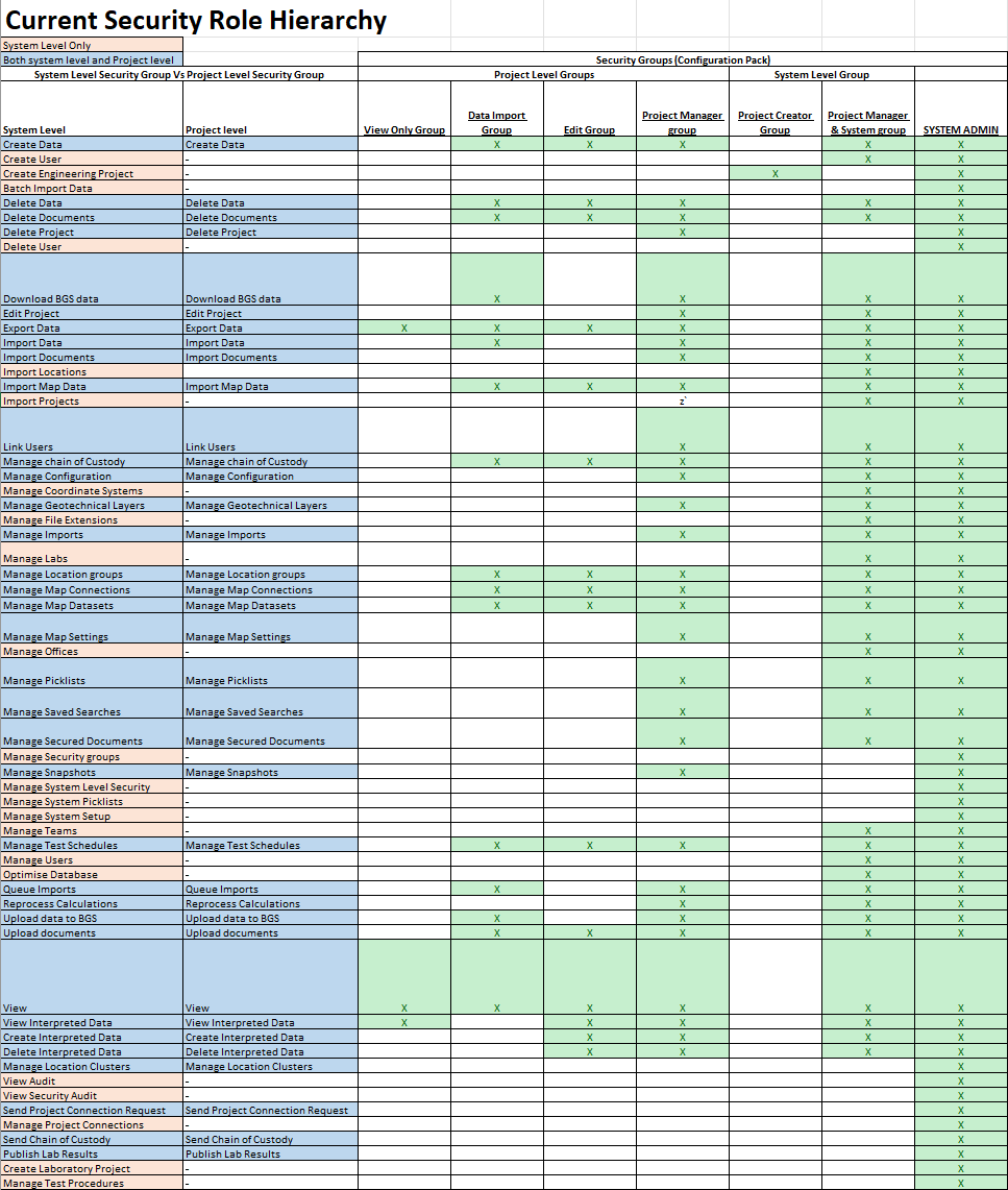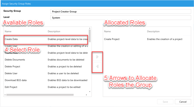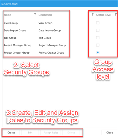 Specific access within System Level Access and Project Level Access are controlled within via Security Groups, and is made up of individual Security Roles. This is designed to give granular control over user’s access within each Security Group.