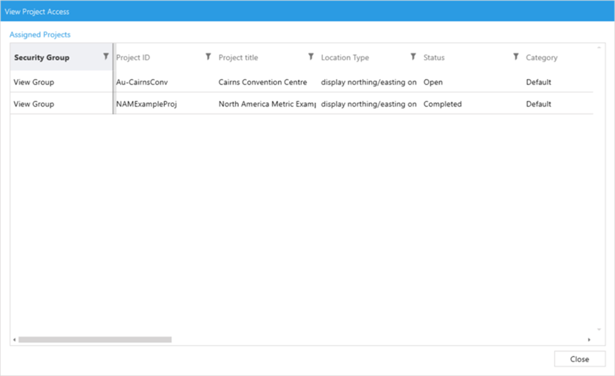 When you click on View Access, a read-only dialog window will be displayed and will show you a complete list of all the projects you are assigned to, and the Security Group associated with that Project.