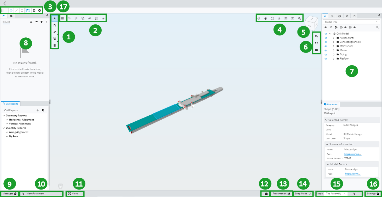 | 8. Issues, Data Visualization, Civil Reports | Display a list of Issues associated to the iModel, Data Visualization, Civil Reports and Analysis. |
