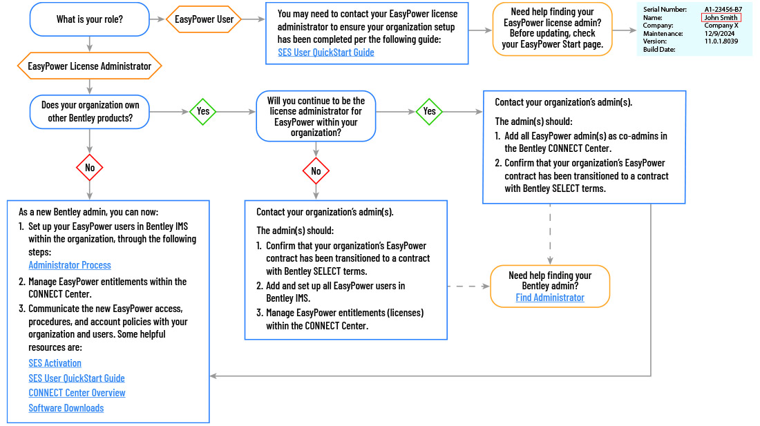 In order for current EasyPower users to download the latest version of EasyPower 2024, you will need to create or sign in to a Bentley user account, if you don't already have one. Follow the flow chart below to see which steps apply to your situation. (click the image below to see the full resolution image)