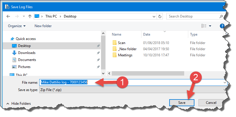 Provide a log file name and location to save the log files, Suggest the "user name - SR number" and save to the Desktop