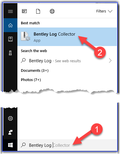 2. Type "Bentley Log Collector" and select the application shortcut to start the software as seen below: