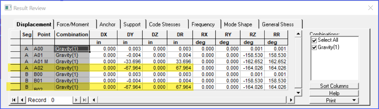 Note: both the displacement and rotation results of segments A and B are exactly the same.