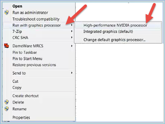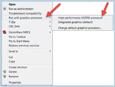 d: Select Run with graphic processor, and then select High performance NVIDIA processor