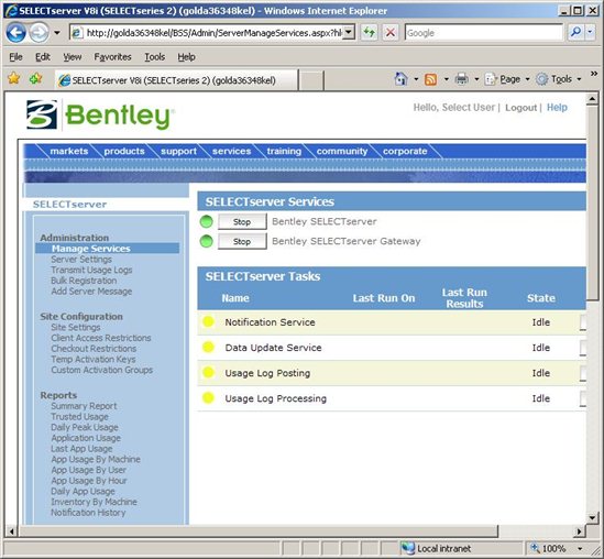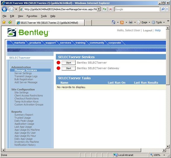 Sollten die Dienste nicht gestartet werden können, weil nicht genügend Rechte für den Benutzer ASPNET zur Verfügung stehen, können die Dienste auch über Systemsteuerung > Verwaltung > Dienste gestartet werden, die Dienste sind mit "Bentley SelectServer" und "Bentley SelectServer Gateway" benannt. Um dem User ASPNET die Rechte zu geben, braucht dieser nur der Gruppe Hauptbenutzer hinzugefügt zu werden.