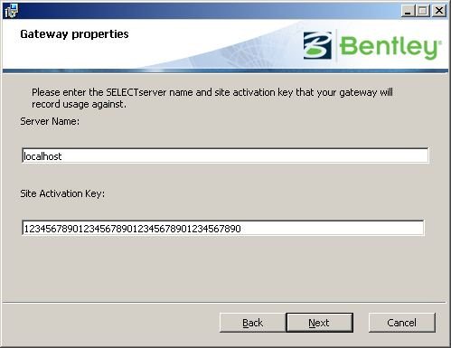 Die folgende Eingabemaske fragt nach dem Servernamen und Site Activation Key, localhost wird vorgeschlagen, da im Augenblick das Gateway auf demselben Rechner wie der Selectserver selbst installiert werden soll. Spricht aus Sicherheitsgründen etwas gegen "localhost", kann dies entsprechend durch den Servernamen oder IP geändert werden. Im Anschluß an die Installation können diese Daten über das License Management Tool (licensetool.exe im Installationsverzeichnis des Selectservers) verändert werden, mit "Next" weiter