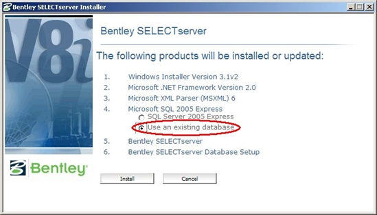 Da wir in unserem Fall die Datenbank behalten wollen, bitte hier die Alternative wählen und mit "Install" weiter (ansonsten wird eine zusätzliche SQLServer Instanz installiert und konfiguriert):