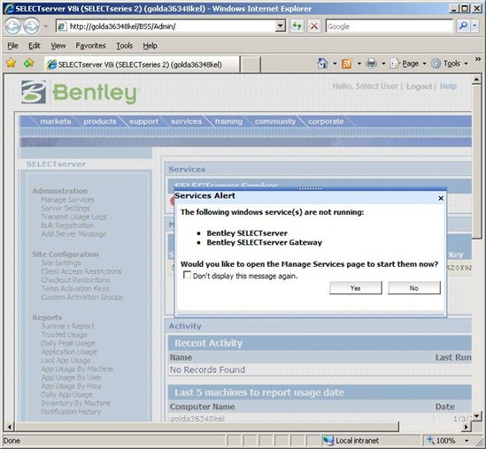 Da die Datenbank bereits alles notwendigen Konfigurationsdaten beinhaltet, erscheinen keine weiteren Abfragen, sondern es öffnet sich die Administratorseite des Selectservers, eventuell mit der folgenden Abfrage, ob die Dienste gestartet werden sollen. Falls dies erscheint, wählen Sie "Yes", um in den Menüpunkt "Manage Services" zu wechseln. Falls die Frage nicht kommt, die Dienste aber noch nicht gestartet sind, wechseln Sie bitte zu "Manage Services":