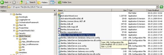 Damit die neue SelectServer Version installiert werden kann, muss die alte Version zunächst deinstalliert werden. Bevor man dies durchführt, empfehle ich zunächst einen Screenshot von den bisherigen Datenbankeinstellungen zu machen. Wechseln Sie dazu in das Installationsverzeichnis des alten Selectservers und starten das Programm Bentley.SelectServer.Database.Setup.exe, hier der Inhalt des Installationsverzeichnisses: