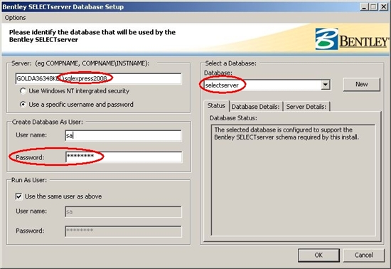 Das geöffnete Datenbankkonfigurationstools hat folgendes Aussehen, machen Sie sich am besten ein Screenshot oder notieren Sie sich die Angaben, wichtig sind die rot eingekreisten Angaben, wobei der Instanzname des SQL Server Installation meistens "selectserver" lauten wird, genauso wie der Datenbankname. Falls Sie das Kennwort für den Benutzer sa der SQL Server Version nicht kennen, infomieren Sie sich, bevor Sie mit dem Deinstallieren des SelectServers fortsetzen.