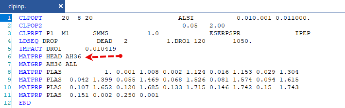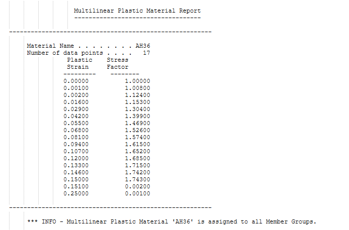 The MATGRP lines are used to assign the AH36 material model to X different member groups and followed by several MATPRP PLAS lines to define the material model for AH36.