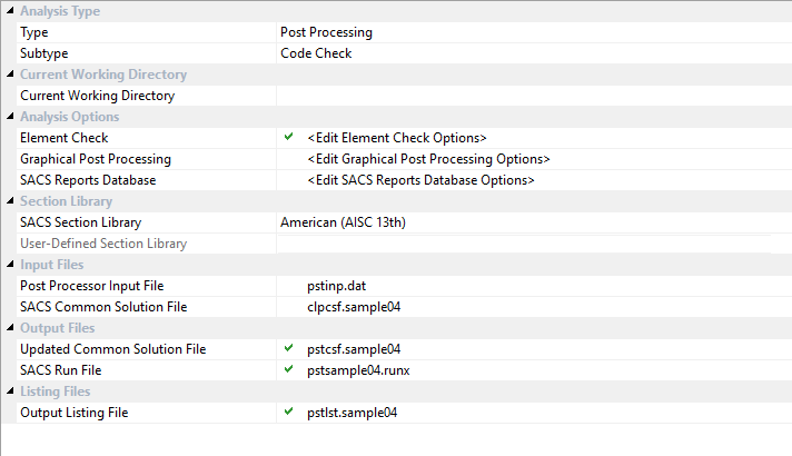 Also, make sure to select all the options you need for the post-processing (including deflection, UC, and stress reports) in the post input file. Otherwise, you won't see the tables in the listing files. The Execute option on the PSTOPT line in the post input file should also be set to YES so that the Post module performs a code check.