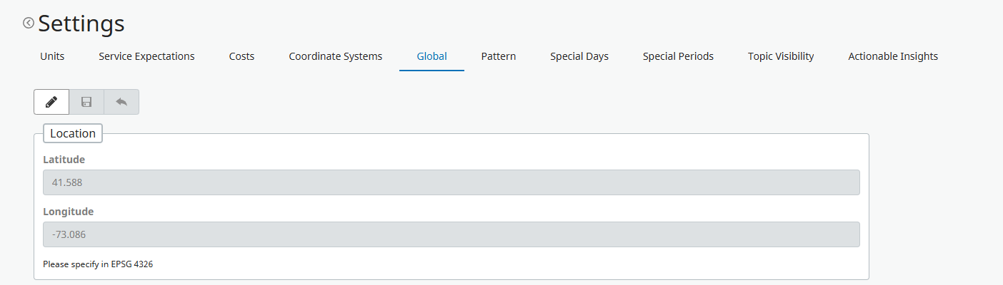 In order to correctly bring the weather data, it is required that the user correctly defines the coordinates of the digital twin (central place), in the Administration >> Settings >> Global. Only one location per digital twin is supported.