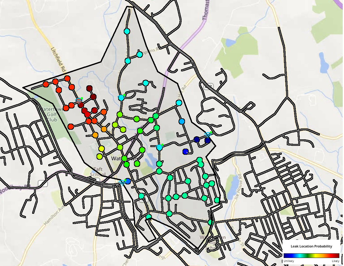 The geolocation results (Figure 1) include a map with the nodes colour coded by likelihood of leak as well as the identification of all flow and pressure sensors used in the geolocation run. Check that all the inflows and outflows into the zone are being considered as well as all pressure sensors within the zone.