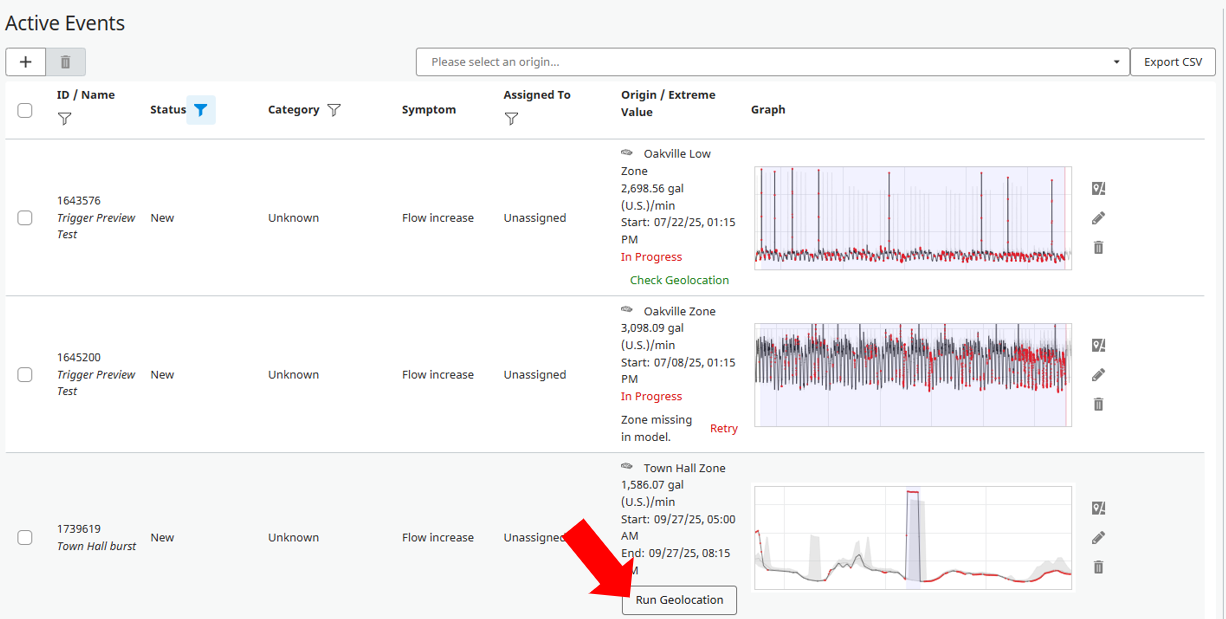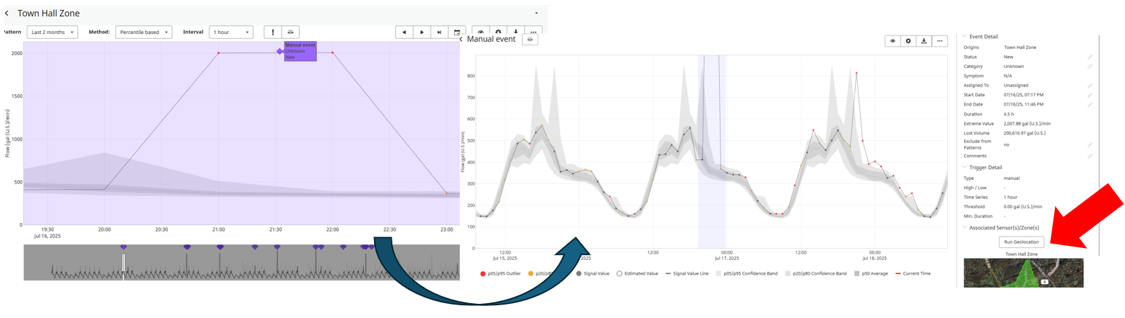 If an automatic event is generated, the user should always first validate the event by looking at the graphs and discard potential false positives. Only if there is a chance to exist a leak, the user should trigger the run geolocation to understand most likely location. A typical workflow is represented in figure below.