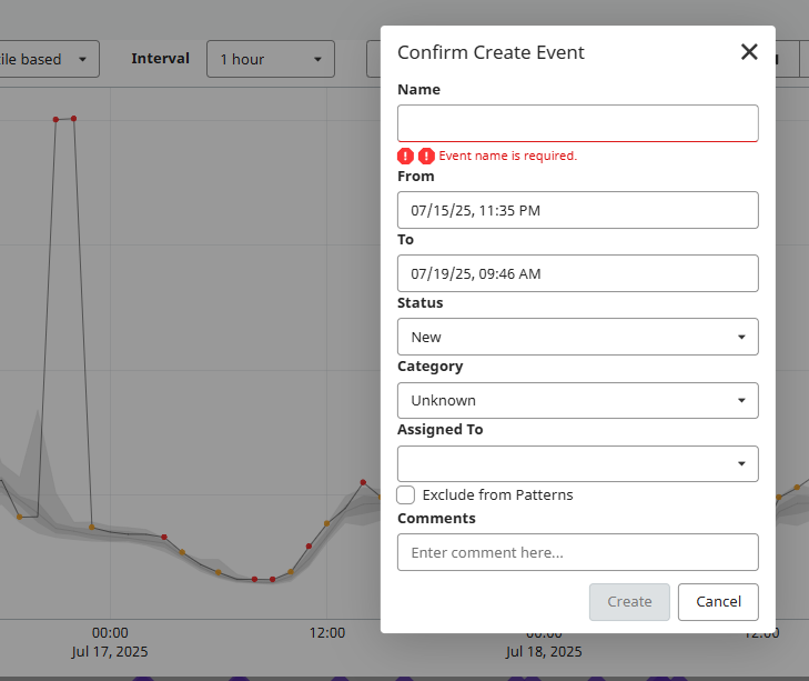 5. Click on the create event button ( ). Give a name to the event, and make sure to correctly adjust the start and end date of the event. This is very important to make sure that the leakage geolocation results are maximized. Categorize the event and update the status. Click Create.