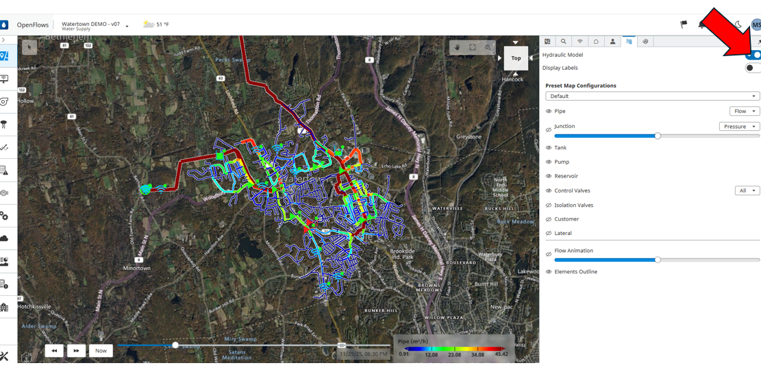 In WaterSight the user can access the real time model results for any element by accessing the map page, and toggle on Hydraulic Model on the side panel, as shown below: